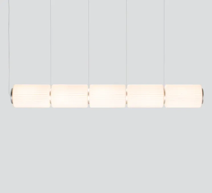 Découvrez l’étonnante suspension Column 175 horizontale, avec 5 cylindres et finition ivoire, imaginée par Lukas Peet pour la maison canadienne A-N-D.
