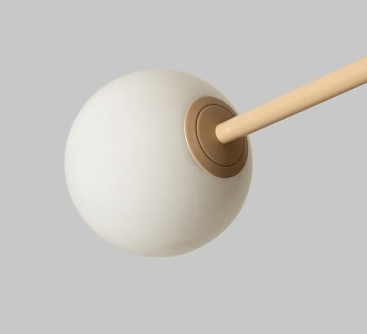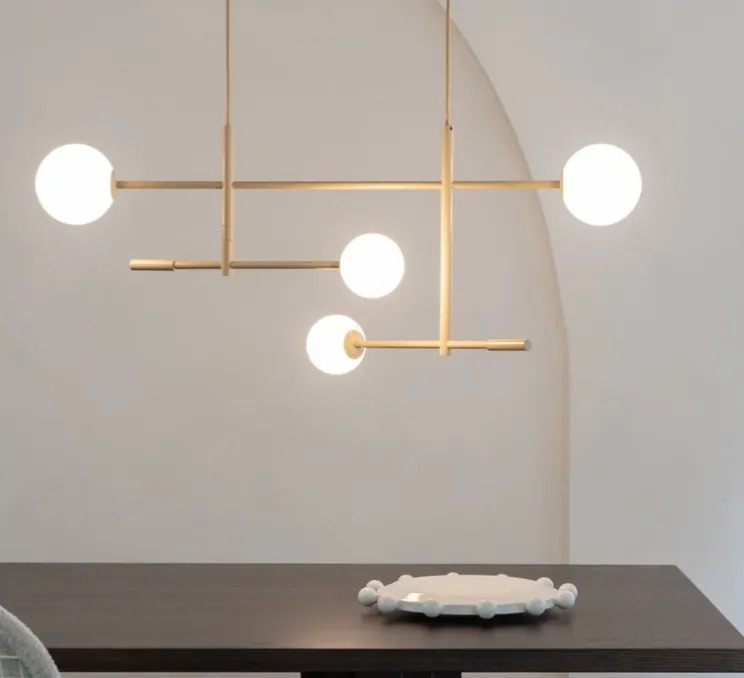 Son design se distingue par la combinaison de tiges élancées et de quatre globes en verre qui composent une structure aérienne et graphique.