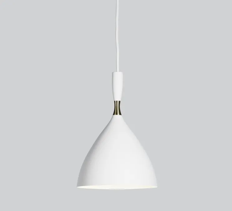 Le luminaire Dokka est composé d’un abat-jour en acier à la forme arrondi avec un intérieur blanc, un détail en laiton et d’un câble en caoutchouc blanc et d’une rosace semi-sphérique en acier blanche.