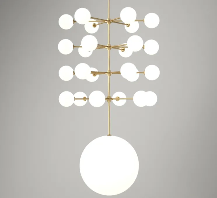 Conçue par deux sœurs autrichiennes Gwendolyn Et Guillane Kerschbaumer, cette suspension possède une structure à 4 bras et est composée d’une sphère en métal laqué époxy et/ou laiton brossé et verre.