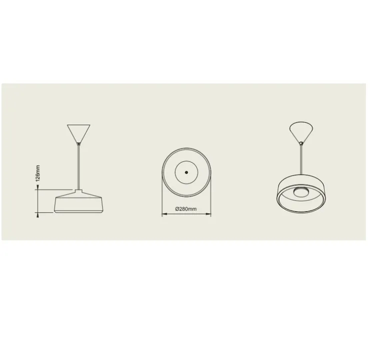 La suspension Flame Wide mesure ⌀28cm et 12.6cm de hauteur. Variateur à triac. Driver inclus. L’indice de protection est IP44, la suspension s’installe en intérieur mais également en extérieur. L’ampoule est incluse avec une puissance maximale 15W, 2700K et 800lm. La rosace noire est incluse. Le câble est en textile noir.