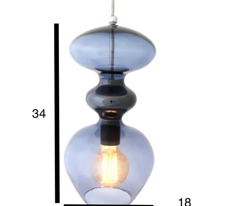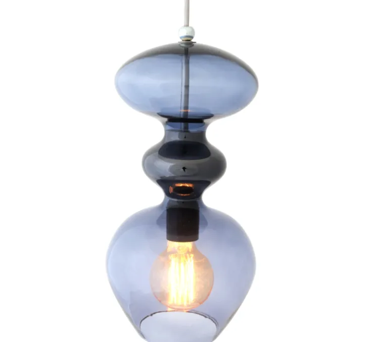 Le design translucide du verre à la teinte bleue fumé et aux courbes féminines, est embelli par un camaïeu de bleues ainsi qu’un cerclage sur le milieu de la lampe