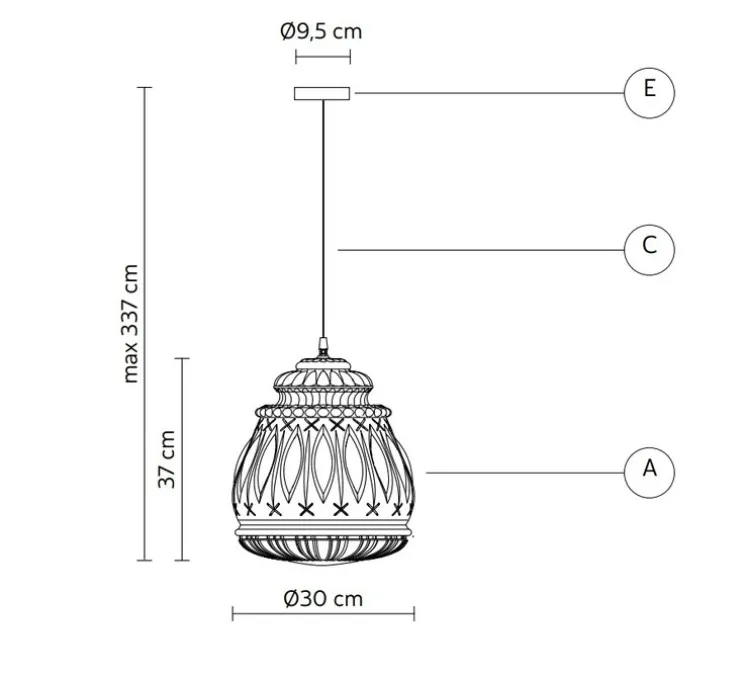 Le diamètre de l’abat-jour est de 30cm et sa hauteur est de 37cm. Le câble de la suspension est en textile et la rosace est incluse.