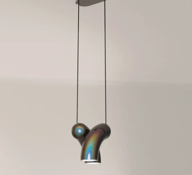 Par son revêtement noir chromatique, la suspension prend différentes teintes en fonction de son environnement. C’est alors un véritable jeu de lumière qui s’installe et qui varie tout au long de la journée. Dans un salon ou dans une chambre, Hyphen unit les opposés pour créer de l’harmonie. Sa couleur irisée donne alors vie au luminaire pour offrir une présence magique.