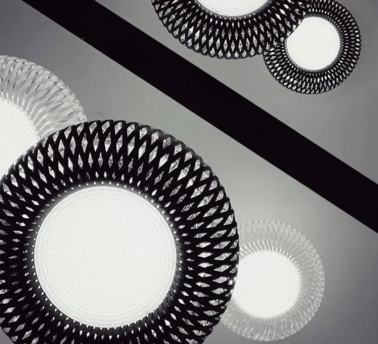 Faite de Lentiflex® transparente et de polycarbonate, la lumière est diffusée tout autour de l’abat-jour de manière agréable ! Cette spécificité vaut le nom de son coloris : prisme ! Kalatos est inspirée des techniques de tressage des paniers avec une pointe de high-tech !