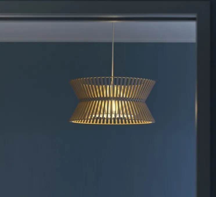 L’abat-jour exceptionnel de la lampe à suspension est en bouleau pressé certifié PEFC. Pour Secto Design, des experts ont produit cette silhouette en X unique à la main. Les nuances sont faites de lamelles de bouleau stratifiées reliées par des anneaux de contreplaqué d’avion.