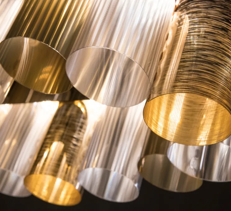 La Lollo est un hommage aux grondements des années 50. Les cylindres en technopolymère, dans des nuances variées de métallisation prismatique contemporaine et de motifs géométriques, alternent autour d’un anneau central éclairé.