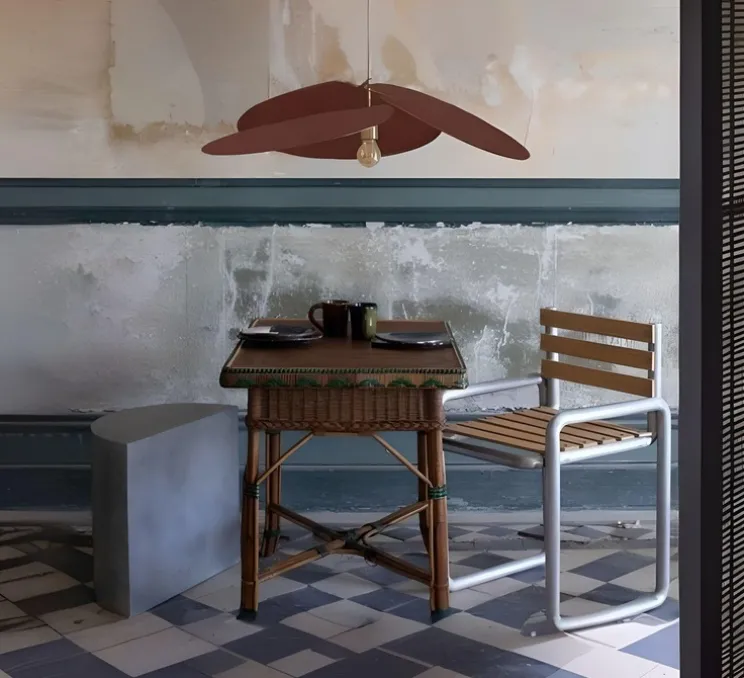 Cette suspension est un luminaire décoratif aussi bien de jour que de nuit (la couleur du tissu peut varier suivant l’éclairage). Son design est plus épuré que celui du modèle Pale et plus en rondeur. Les pales plus rondes cette fois-ci conservent les accents ensoleillés et la touche naturelle caractéristiques de Georges. Pensée trouve facilement sa place dans une chambre ou un salon et peut être l’atout coloré de votre cuisine ou de votre bureau.