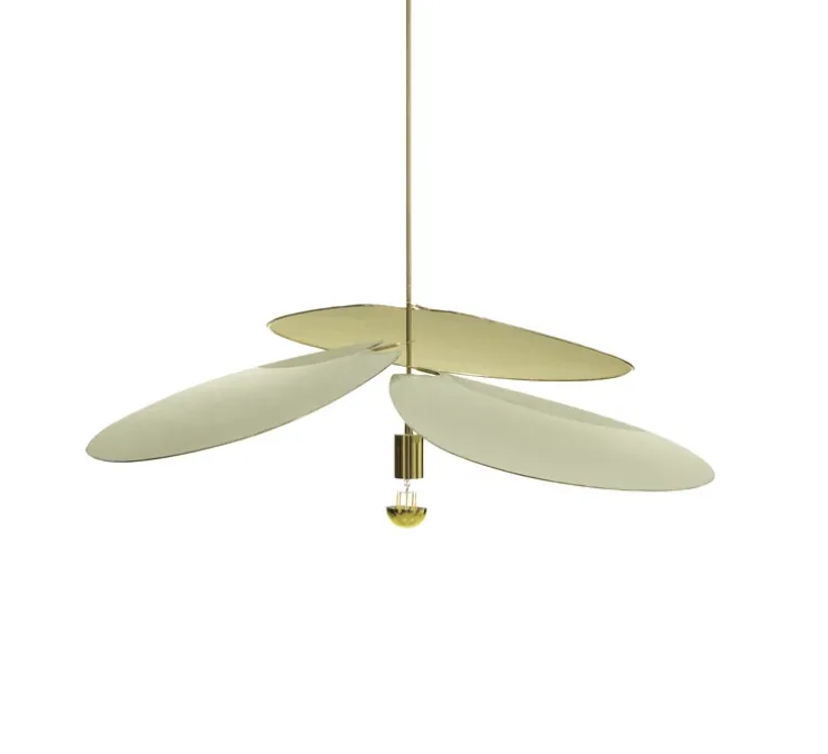 Pensée est un luminaire de forme organique dont le design fait penser à des pétales volant au vent. Dans cette version de 85cm de diamètre, la suspension est composée de 3 pales en coton avec des arceaux en laiton. Cette disposition offre un jeu d’ombres poétique et floral à votre pièce.