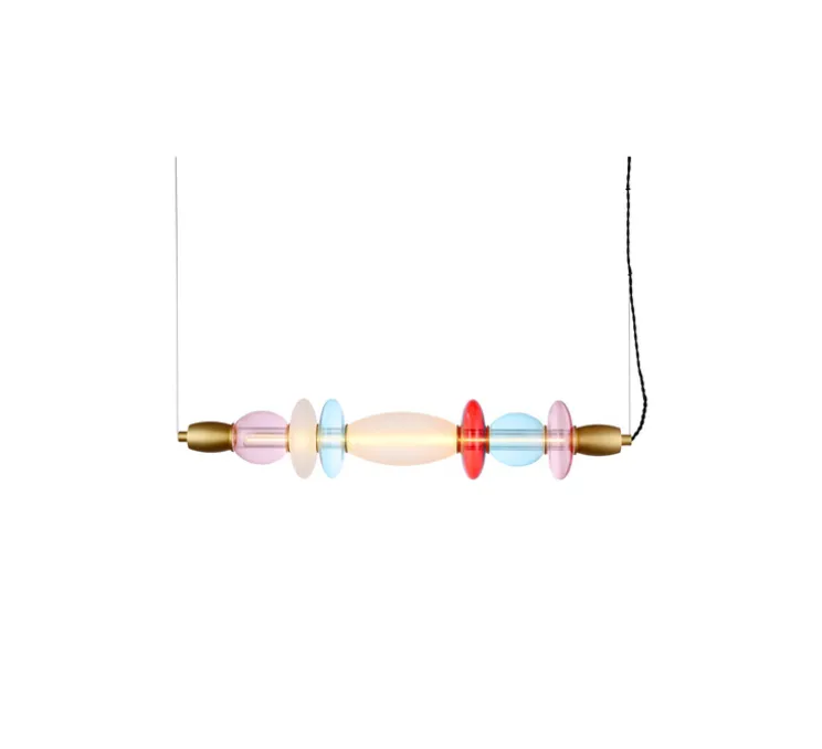 Cette suspension en verre et aluminium se distingue par une variété de couleurs telles que le bleu, rose, rouge et blanc opaque.