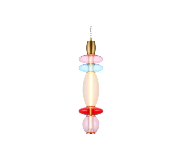 Cette suspension en verre et aluminium se distingue par une variété de couleurs telles que le bleu, le rose, le rouge et le blanc opaque.