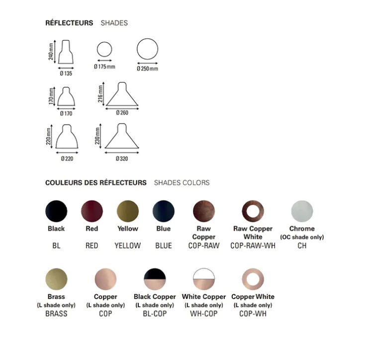 Chaque version est disponible dans une variété d’abat-jours : rond L et rond XL en acier, conique L et conique XL en acier, oculiste en acier, et balle L et balle XL en verre opalin. Les abat-jours en acier sont disponibles dans une variété de couleurs : noir/intérieur blanc, noir/intérieur cuivre*, rouge/intérieur blanc, jaune/intérieur blanc, bleu/intérieur blanc, cuivre brut/intérieur cuivre brut, cuivre brut/intérieur blanc, chrome**, laiton*, cuivre/intérieur cuivre, cuivre/intérieur blanc* ou blanc/intérieur cuivre*.