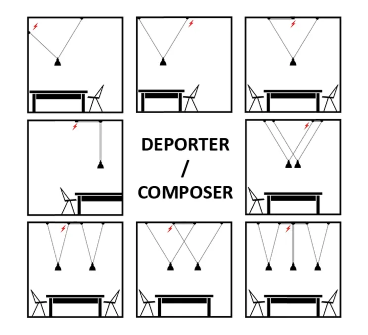 Des accessoires permettent de composer en ligne ou sur quatre axes de multiples compositions à partir d’une seule source d’électricité, ainsi que de déporter la suspension à un endroit précis, peu importe la position de l’alimentation électrique.