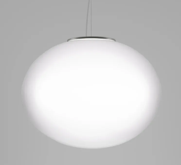 Son abat-jour ovale en verre soufflé satiné, façonné à la bouche, diffuse une lumière douce et chaleureuse, idéale pour sublimer tout type d’intérieur.