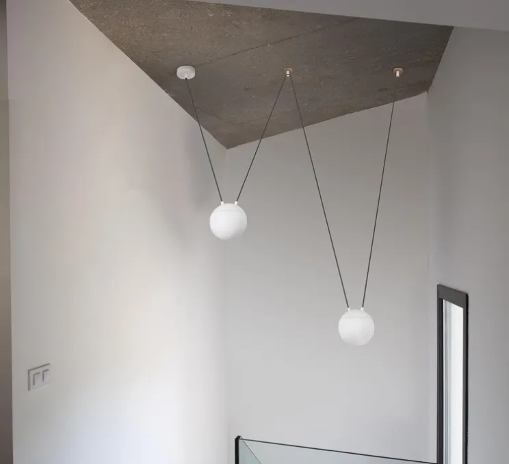 La structure de la suspension est en métal et son diffuseur en verre opale, coloris blanc ou gris foncé. Selon vos besoins, la suspension peut contenir jusqu’à 5 diffuseurs qui éclairent chaleureusement une pièce. Design et versatile, cette suspension est également personnalisable grâce à des petits crochets à fixer au plafond (nombre de crochets sur demande).