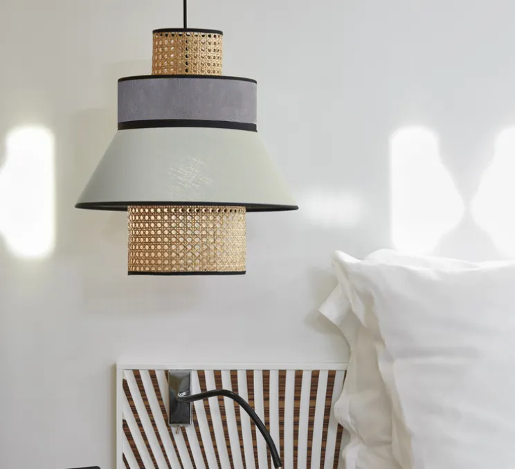 Retrouvez la suspension Singapour GM en format grand ou en format plus petit, fabriquée en lin lavé et en cannage, qui apportent des jeux de contraste étonnant.