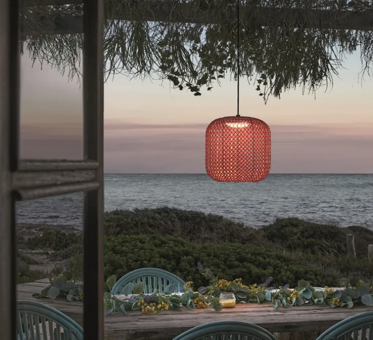 Composée d’un abat-jour ajouré suspendu à une rosace par un câble, cette suspension à l’allure naturelle est idéale pour une terrasse. Les fibres synthétiques utilisées reprennent le dessin des mobiliers en cannage. Ce tressage disperse le flux lumineux pour créer une ambiance chaleureuse. Le style méditerranéen de cette lampe créé une atmosphère apaisante qui rappelle celle du bord de mer. En effet, elle s’inspire du calme et de la beauté de Cadaques où il fait bon vivre.