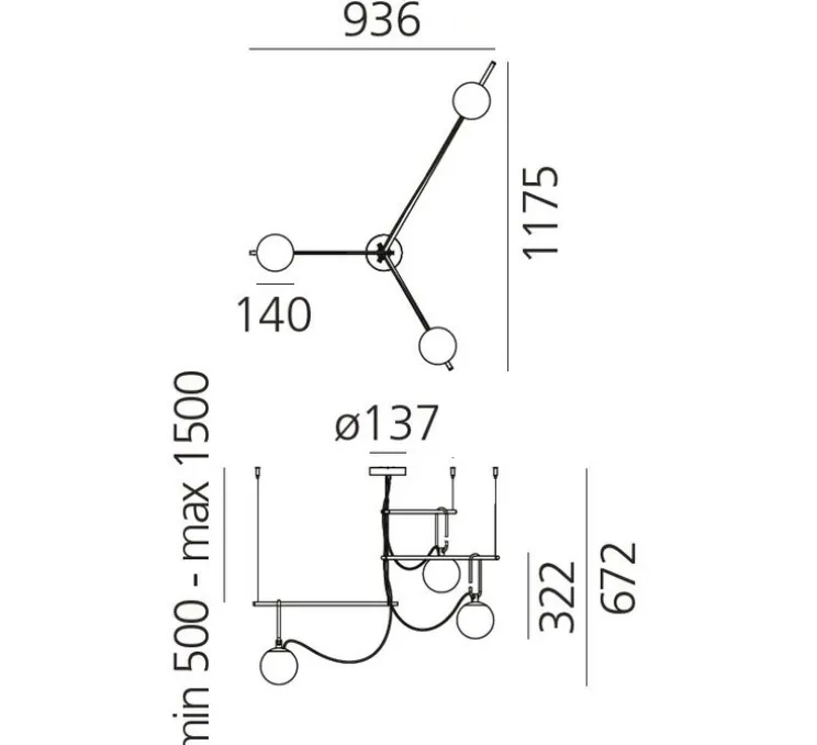 NH est formé de 3 sphères en verre soufflé blanches ainsi que d’anneaux en laiton brossé. Ceux-ci s’accrochent chacun à une structure en aluminium peint en noir. La source lumineuse n’est pas incluse. Nous vous conseillons trois ampoules LED E14, 15W. Dimmable en fonction des ampoules utilisées.