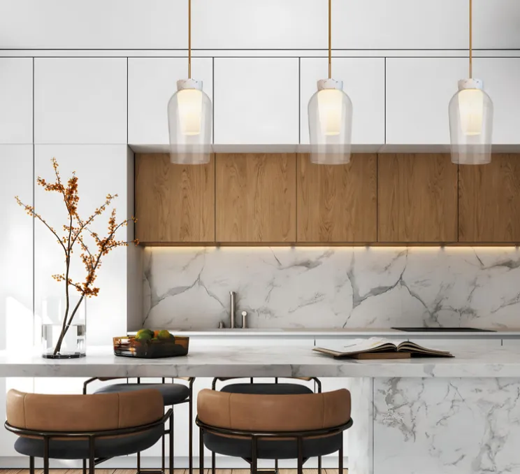 D’une forme ovale, cette suspension présente un diffuseur blanc surmonté d’un abat-jour en verre transparent, créant un éclairage diffus à 360 degrés. Son cylindre en finition marbre blanc relie le diffuseur au câble doré, ajoutant une touche naturelle à la structure.