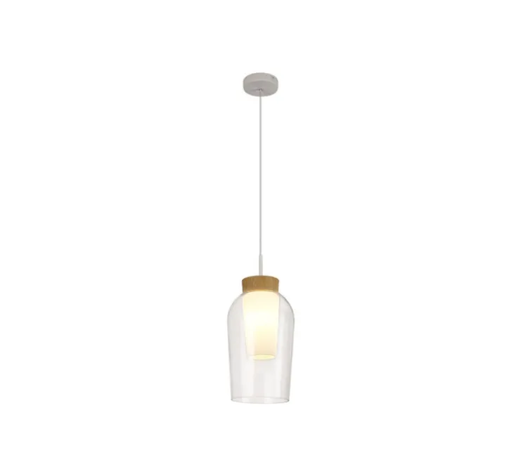 D’une forme ovale, cette suspension présente un diffuseur blanc surmonté d’un abat-jour en verre transparent, créant un éclairage diffus à 360 degrés. Son cylindre en bois relie le diffuseur au câble blanc, ajoutant une touche naturelle à la structure.