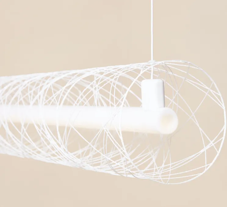 Cette suspension de couleur blanche design et élégante, est composée de fibres industrielles enroulées, renforcées avec de la résine et réalisée par un robot autour d’un moule en motifs géométriques.