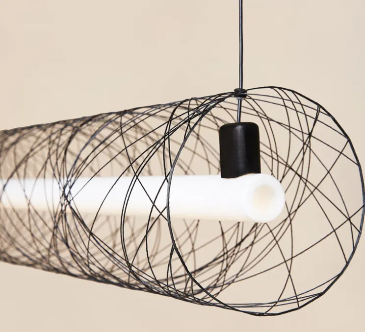 Ce luminaire design est fabriqué à partir de fibres industrielles imprégnées de résine, qui sont enroulées avec un robot industriel autour d’un moule en motifs géométriques.