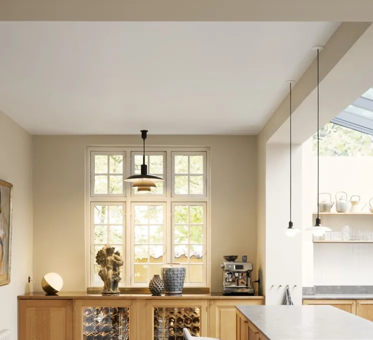 Dotée d’un câble noir de 4 mètres de longueur et d’une ampoule E27, la suspension PH 5/5 diffuse une lumière douce et uniforme à 360 degrés, idéale pour éclairer efficacement les grands espaces. Avec une puissance maximale de moins de 70 W, elle assure un éclairage de qualité tout en mettant en valeur la finesse du design danois.