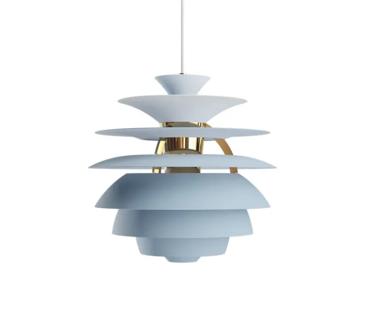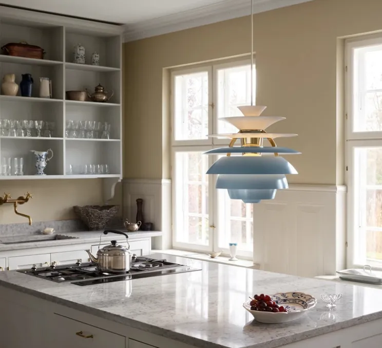 La forme sphérique de la PH Snowball repose sur un empilement de huit abat-jour en aluminium laqué bleu, soutenus par une structure en laiton. Le contraste entre les finitions brillantes sur le dessus et mates en dessous des diffuseurs crée une lumière douce, sans éblouissement. Sa silhouette architecturée convient aux intérieurs scandinaves ou modernes, suspendue au-dessus d’une table de repas, dans un salon ou un hall.