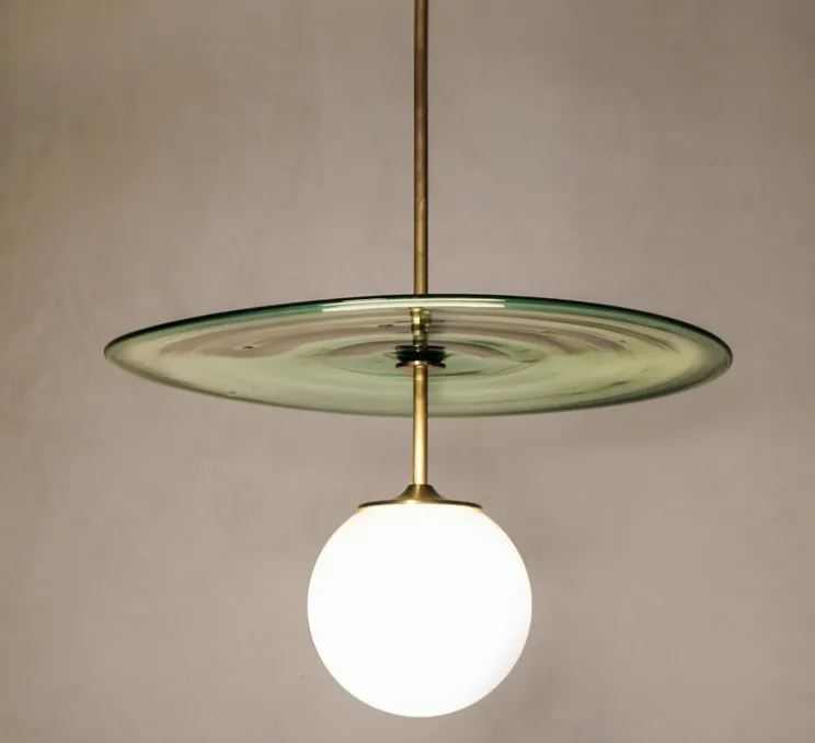 Cette suspension à l’aspect minérale qui semble s’inspirer de l’environnement méditerranéen est conçue à partir d’une structure en laiton et d’un disque en verre soufflé dans la verrerie de Gordiola ́s à Majorque.