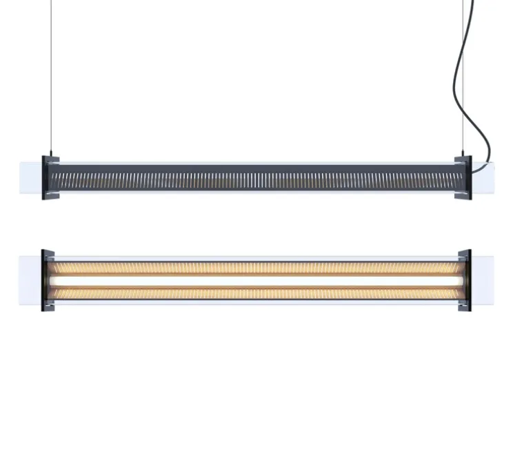 La suspension P1 se compose d’une enveloppe cubique transparente encerclée par une structure en acier à chaque extrémité. Un réflecteur et une grille à perforations « persiennes » viennent entourer la source lumineuse. L’éclairage se fait alors de manière directionnelle vers le bas. L’éblouissement est limité tout en apportant un éclairage optimal et qualitatif.