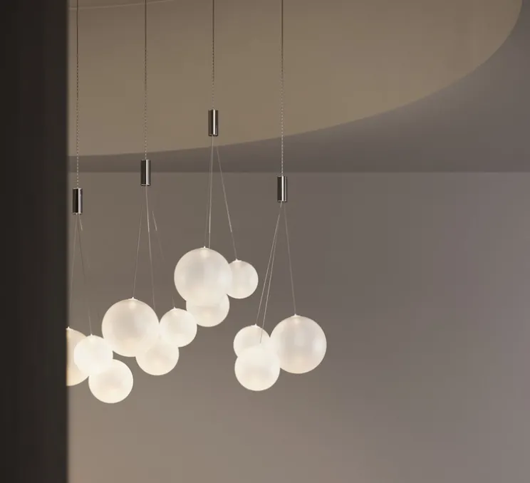 La suspension Random se compose de trois sphères aux dimensions variées : 12 cm, 14 cm et 18 cm de diamètre, offrant une esthétique asymétrique et dynamique. Les sphères, en verre soufflé à la bouche, diffusent une lumière douce et homogène grâce à leur finition blanche givrée. Le métal chromé de la structure ajoute un contraste subtil tout en apportant une touche de brillance. Idéale pour une installation en cascade dans un escalier ou comme pièce maîtresse dans un bureau chic, elle se marie parfaitement avec d’autres éléments de la collection Random pour créer une décoration personnalisée et harmonieuse.