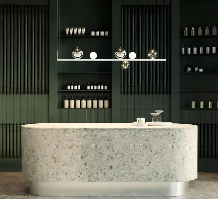 D’une grande flexibilité décorative, la suspension Random Stick long se distingue par ses dimensions généreuses de 150 cm de long et 2 cm de diamètre. A travers la disposition des diffuseurs sphériques de tailles variées (de 10 à 18 cm), la créatrice présente un luminaire au design subtile et poétique rappelant de fragiles bulles de savons prêtes à s’envoler dans les airs.