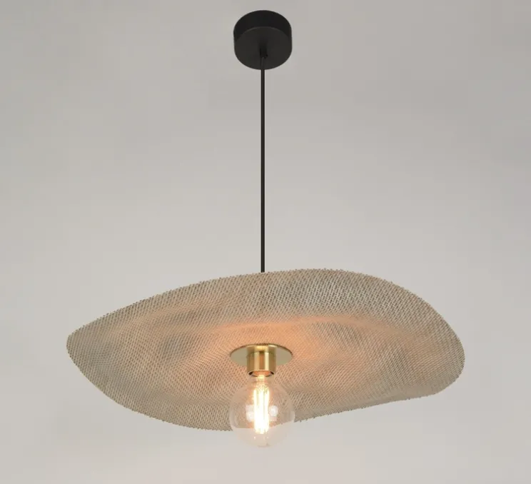 Cette suspension est composée d’une lumière avec abat-jour en matière Varian®. Equipée d’un cordon textile silicone d’une longeur d’1m50. Ainsi que une bague en laiton brossé et d’un pavillon en métal sablé adaptable DCL. La suspension mesure 58cm de diamètre. L’ampoule est non incluse, nous préconisons une ampoule E27-60W.