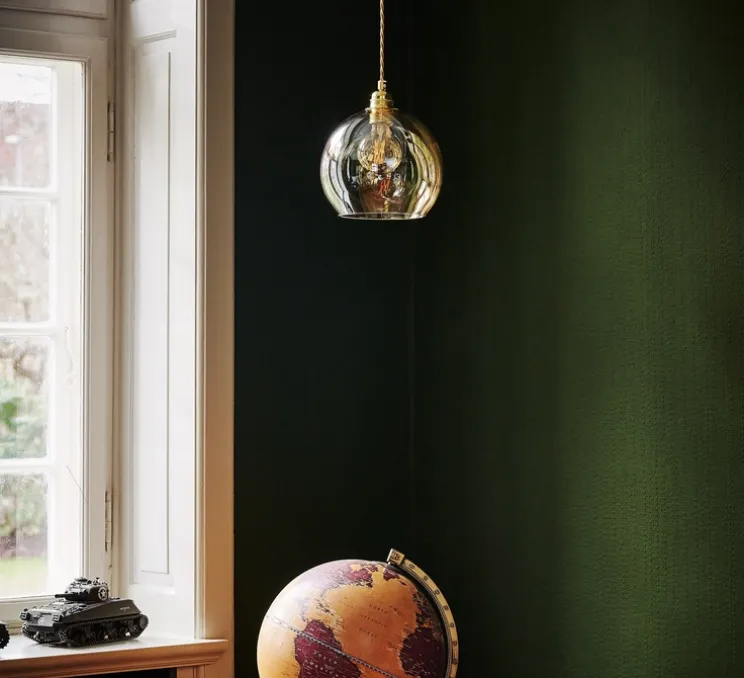 La suspension sphérique Rowan 15,5 est donc un incontournable de la marque, Susanne Nielsen propose de plus en plus de couleur et de finition pour cette suspension qui est très populaire. Sa couleur caméléon, accompagné d’or, rappelle une perle ou une bulle de savon grâce aux effets iridescents de la couleur avec le verre. On remarque une jolie valse de couleur entre du rose et du vert. La lumière est diffuse de manière douce, elle n’éblouie pas.