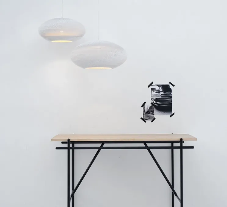 La suspension toute de blanc vêtue Disc 24, signée par les designers américains Seth Grizzle et Jonathan Junker, est constituée de fines strates de carton découpées au laser et assemblées à la main dans leurs studios à Amsterdam. Cette suspension reflète un engagement éco responsable.