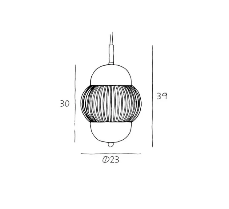 La suspension mesure 23 cm de diamètre et 39cm de hauteur maximum (30 cm pour le globe et 9 cm pour la tige). Le câble blanc mesure 2,5 m.