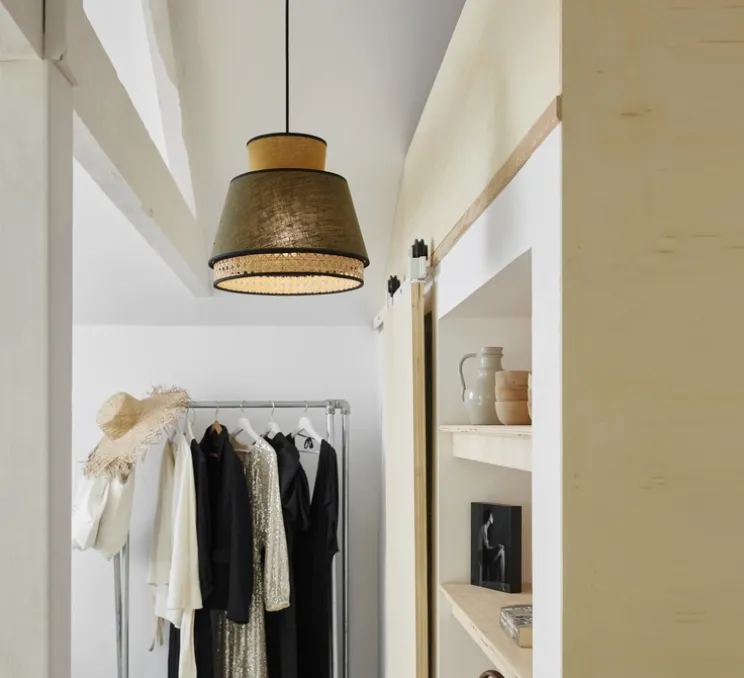 La suspension est composée d’un empilement de 3 abat-jour en lin lavé et cannage. Elle est également équipée d’un cordon textile (1,5m) et d’un pavillon en métal adaptable DCL. Elle mesure 23 cm de hauteur et 30cm de diamètre.