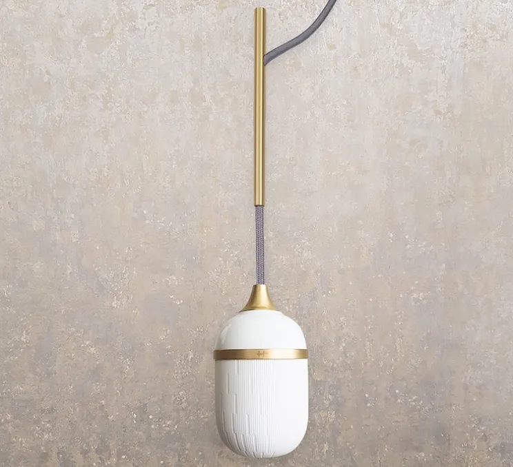 - porcelaine, laiton brossé, acier laqué, fil tissé coloré