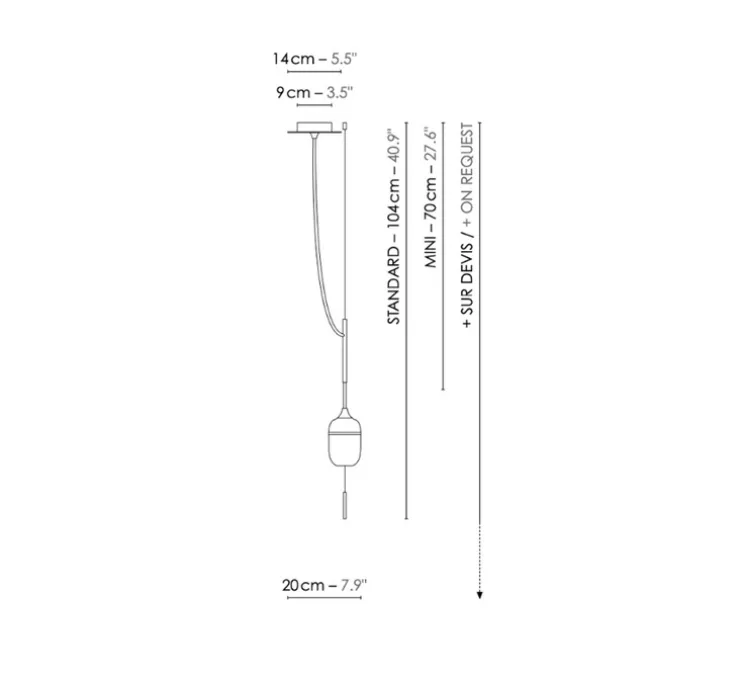 Cette suspension mesure 20cm de longueur et 10cm de largeur. L’abat-jour mesure 12,5cm de hauteur pour un diamètre de 8,6cm. La plague circulaire a un diamètre de 14cm et le boîtier électrique un diamètre de 9cm pour une hauteur de 3cm. Le carillon en laiton mesure 7cm de longueur.