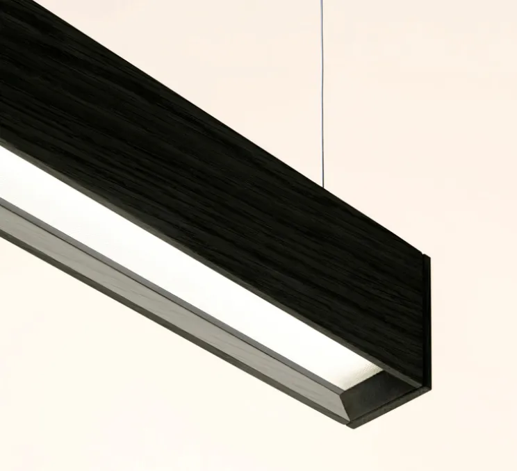 En coloris noir, sa silhouette longiligne et son diffuseur à microprisme en font un luminaire discret et graphique. Elle convient parfaitement à une salle à manger, un bureau ou un espace de travail, où elle structure visuellement l’espace tout en apportant une lumière chaude et précise.