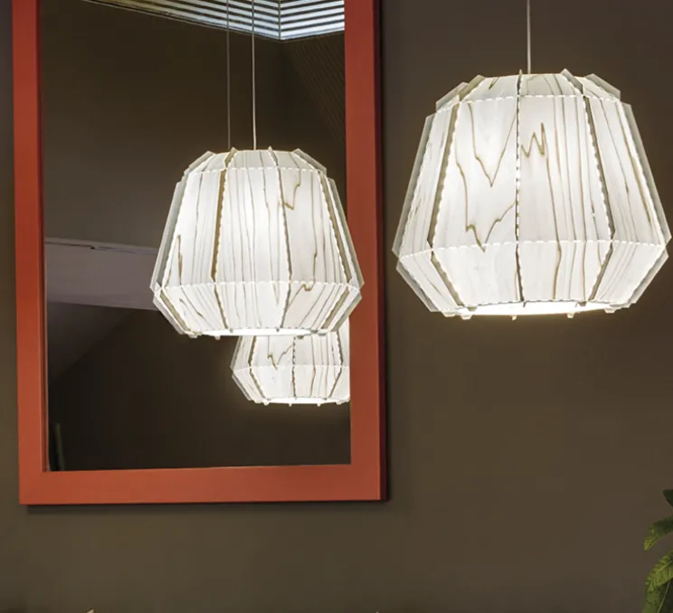 Ici, la suspension Stitches est composée de lamelles de bois vernis. Chaque lamelle est reliée à l’autre par une couture. Les surpiqûres qui sont en réalité de petits trous laissent transparaitre la lumière d’une manière délicate et douce.
