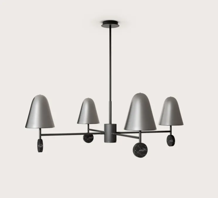 Avec ses quatre abat-jour coniques en métal finition nickel mat, terminés chacun par un disque en marbre noir, la suspension Stor évoque une composition graphique flottante. Son design minéral et sophistiqué permet de structurer visuellement un espace tout en conservant une belle légèreté. Parfaite au-dessus d’une grande table de salle à manger ou dans un séjour aux accents contemporains, elle devient un véritable point focal architectural.