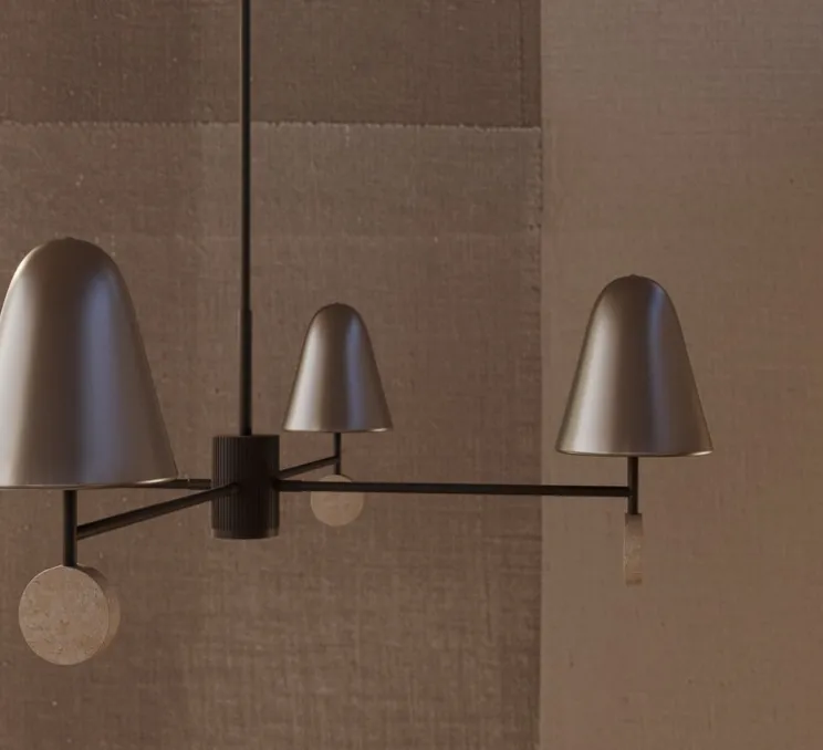 Avec ses quatre abat-jour coniques en métal finition nickel mat, terminés chacun par un disque en travertin, la suspension Stor évoque une composition graphique flottante. Son design minéral et sophistiqué permet de structurer visuellement un espace tout en conservant une belle légèreté. Parfaite au-dessus d’une grande table de salle à manger ou dans un séjour aux accents contemporains, elle devient un véritable point focal architectural.