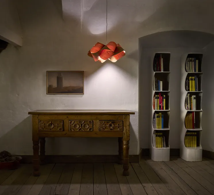 Composée d’une superposition de lamelles de bois courbées et assemblées à la main dans les ateliers de Valence, la petite version du lustre Swirl diffuse une lumière agréable et chaleureuse. Les courbes épurées et élégantes de cette lampe se fondent dans chaque intérieur, que ce soit dans un salon, une salle à manger ou une chambre.
