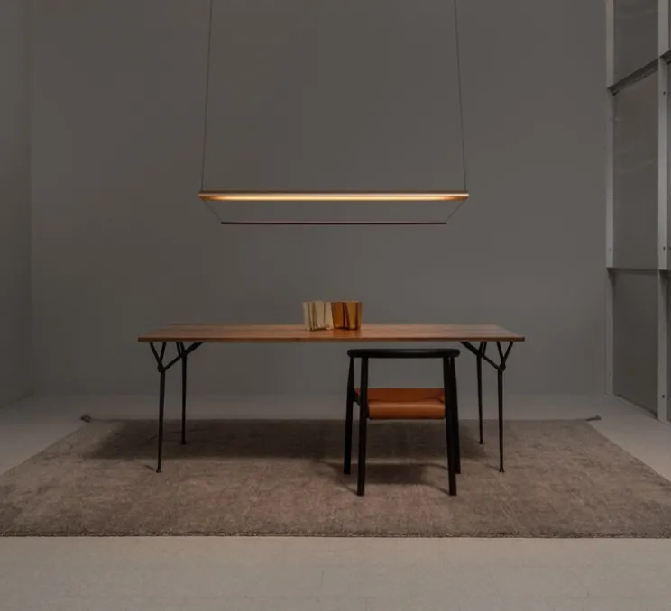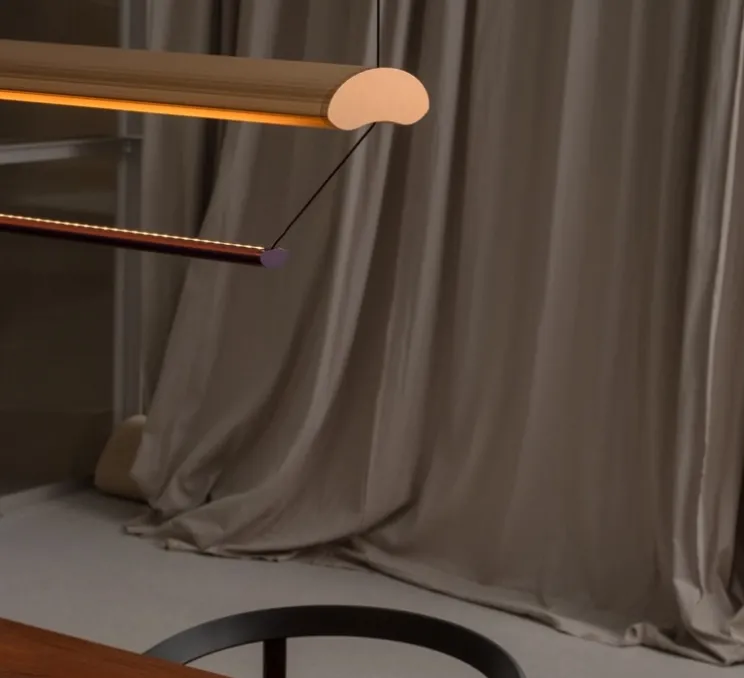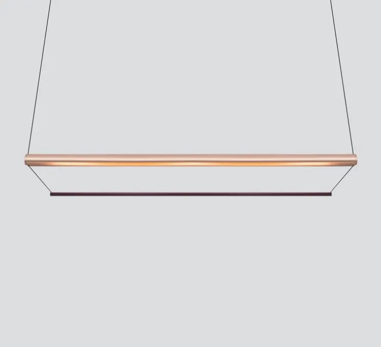 Avec ses lignes longues et structurées (L150 cm x H20 cm), la suspension Tier 150 joue sur une composition modulaire et sculpturale. Sa surface finement cannelée diffuse la lumière de manière uniforme en la réfléchissant sur le corps supérieur, dissimulant avec subtilité la source lumineuse directe. Dans cette version cuivre anodisé et rouge améthyste, elle devient un véritable élément d’architecture intérieure, idéale pour surplomber un grand espace de réception, une table de conférence ou une galerie contemporaine.