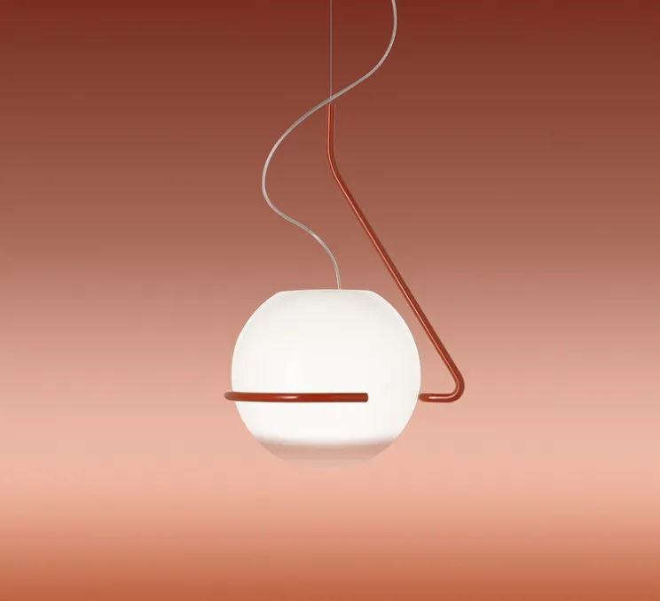 Elle se présente comme un globe en verre entouré par une structure en métal coloré rouge. A la croisée du Good Design et du Radical, ce luminaire met en équilibre ces deux mouvements en opposition. La structure brute encercle le globe en verre opalin dégradé pour allier esprit pop et fonctionnalité.