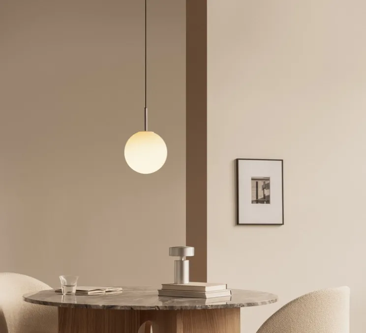 Son abat-jour sphérique en verre opale diffuse une lumière douce et homogène à 360°, éliminant tout éblouissement. Associé à une structure en acier poli miroir, il apporte une touche graphique et élégante à tout espace de vie. Suspendue à un câble textile noir de 3 mètres, cette suspension s’intègre parfaitement au-dessus d’une table de repas, d’un îlot de cuisine ou dans un salon, où elle peut être ajustée à la hauteur souhaitée.