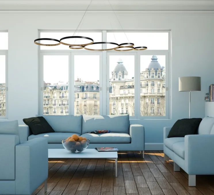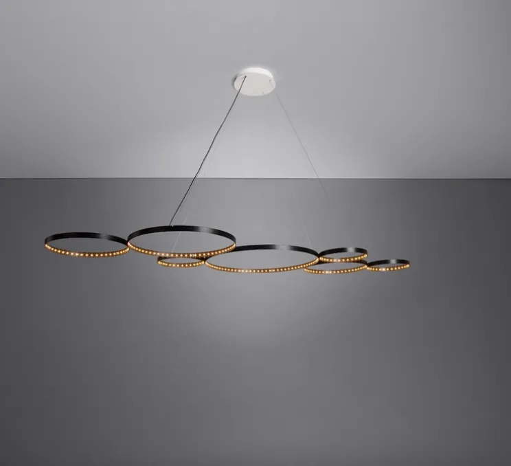 Avec son design épuré, minimaliste et contemporain cette suspension est devenue un luminaire incontournable pour éclairer vos différents espaces qu’il s’agisse d’environnements pour particuliers ou pour professionnels. L’association des 7 cercles permet au luminaire de présenter une forme longiligne pouvant surplomber une grande table à manger ou un bar.