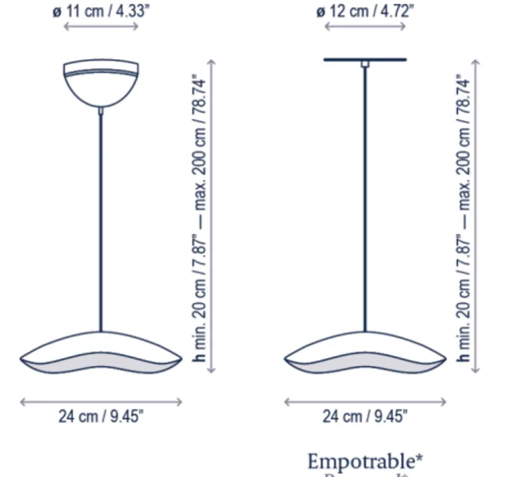 Le luminaire mesure 24cm de diamètre. La cable noir mesure 1,5m. La source lumineuse LED 175lm, 2700kl cri>90 est fournie.