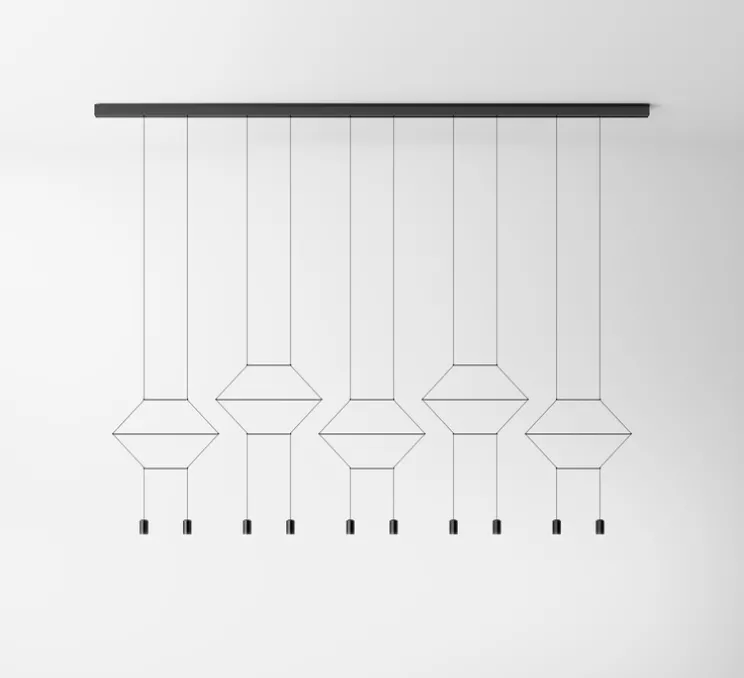 La suspension Wireflow 0330 séduit par son design aérien et graphique, mélangeant tiges métalliques noires et points lumineux minimalistes. Alliant transparence et lignes épurées, elle apporte une touche contemporaine et élégante à tout espace, qu’il s’agisse de salons, de salles à manger ou d’environnements professionnels.